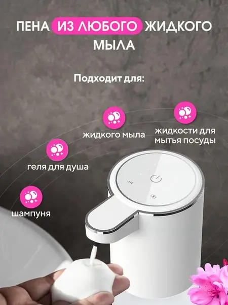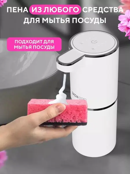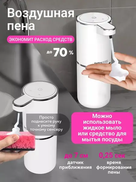 Автоматический сенсорный диспенсер от бренда «HomeKeeper» — это удобное и практичное устройство, которое создаёт воздушную пену из любого жидкого мыла. Он имеет контейнер для загрузки моющего средства объёмом 380 мл и работает от встроенного перезаряжаемого аккумулятора.